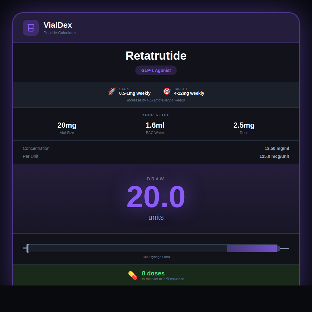 Use VialDex to calculate the exact reconstitution volume and syringe dose for BPC-157. Enter your vial size and BAC water volume for instant results.